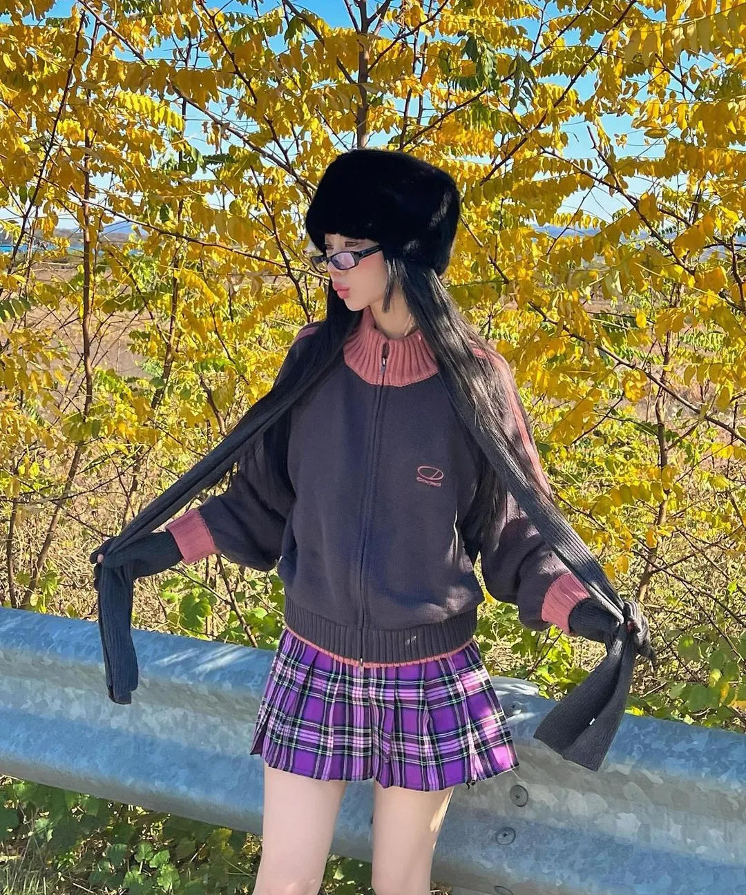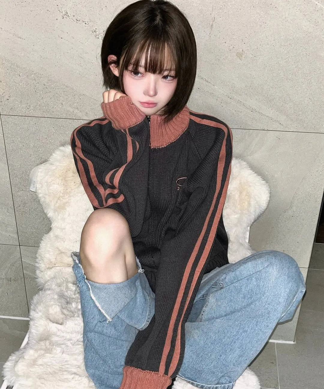 SPORTY TRACK SEMI-CROP KNIT ZIP-UP - CHARCOAL