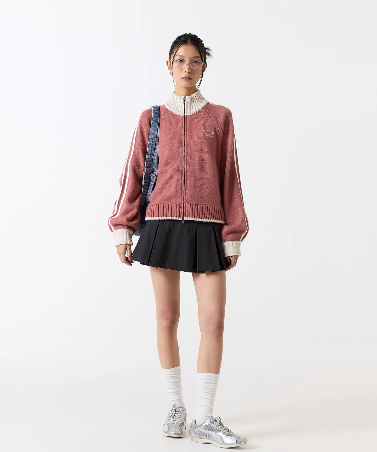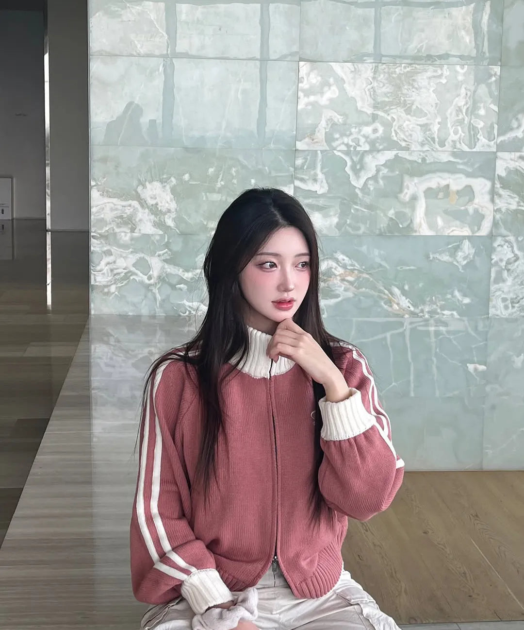 SPORTY TRACK SEMI-CROP KNIT ZIP-UP - PINK